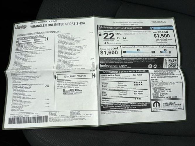 Inside, enjoy seamless connectivity with Bluetooth integration and stay safe with the built-in backup camera. Whether you're navigating city streets or exploring off-road trails, this Jeep offers versatility like no other. Don’t miss your chance to own a piece of automotive excellence that promises both reliability and excitement in every drive. Visit us today to test drive the 2022 Jeep Wrangler Unlimited Sport—your next great adventure awaits!